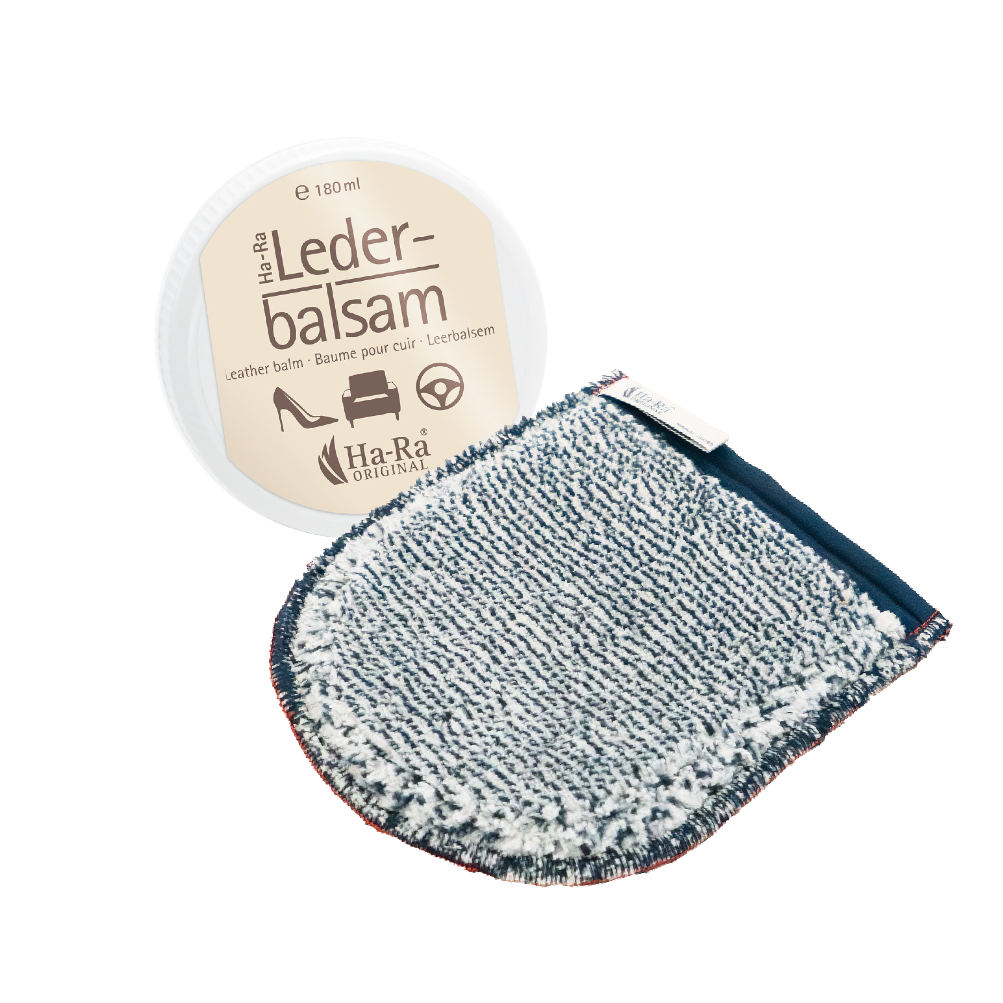 Appliquer une fine couche de baume cuir Ha-Ra sur la surface à traiter à l’aide du gant d’entretien cuir Ha-Ra et laisser agir. Il n’est pas nécessaire de frotter ensuite.