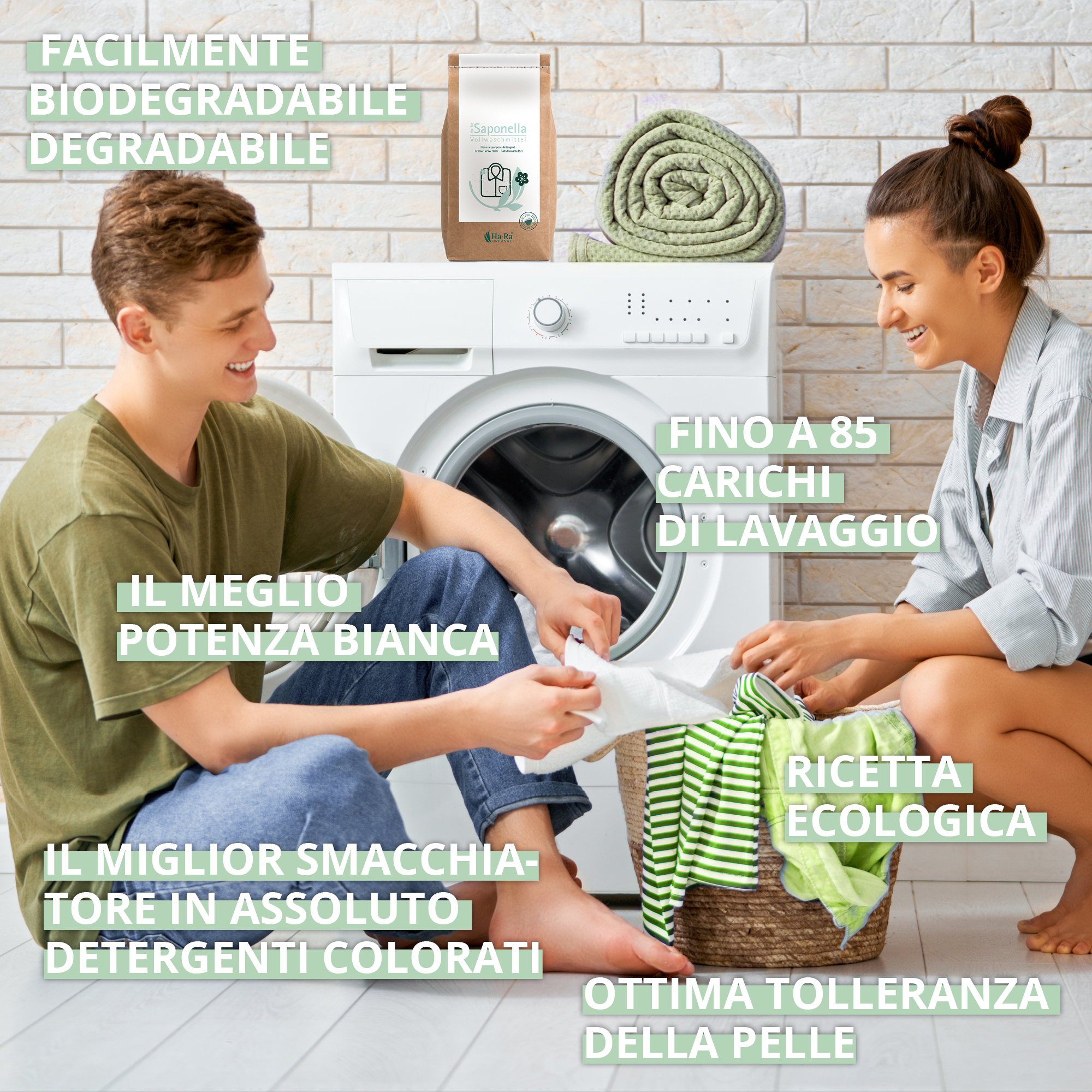 Pulizia dei bianchi in lavatrice. Ideale per la pulizia delle fibre Ha-Ra. Non adatto per lana e seta. CONSIGLIO: Per i colorati consigliamo il detersivo per capi colorati Saponella Ha-Ra.